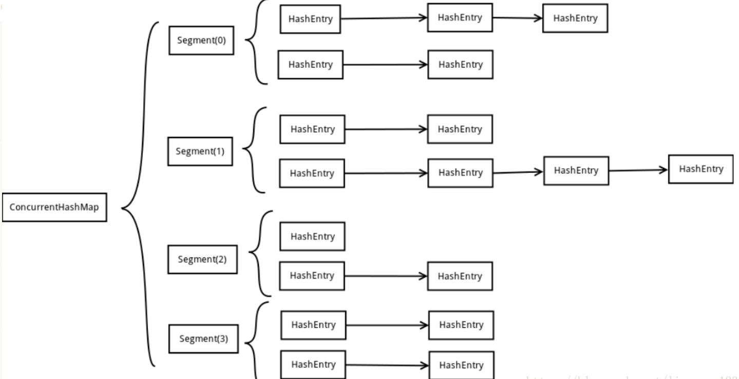 ConcurrentHashMap 中的分段锁称为 Segment,Segment 用来减少锁的粒度,Segment 类似于 HashTable 的结构,即内部拥有一个 Entry 数组,数组中的每个元素又是一个链表。
