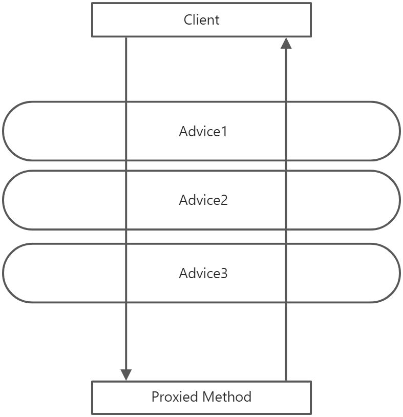 如果Advice1、Advice2和Advice3都是AroudAdvice,那么在proxied method执行前后都会有增强逻辑,其执行顺序是:Advice1的前部增强逻辑->Advice2的前部增强逻辑->Advice3的前部增强逻辑->proxied method ->Advice3的前部增强逻辑->Advice2的前部增强逻辑->Advice1的前部增强逻辑。
