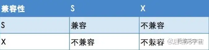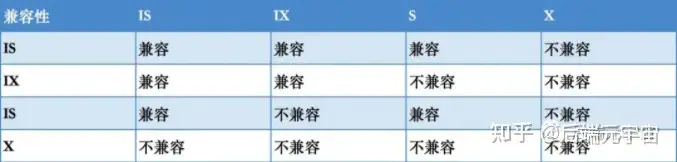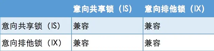 注意这里的排他(X)/共享(S)锁指的都是表锁!意向锁不会与行级的共享/排他锁互斥! 行级别的X和S按照上面的兼容性规则即可。