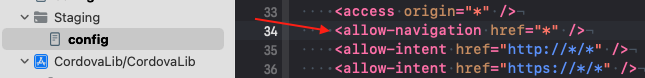 4、通过loadHTMLString: baseURL: 加载html时,NSURL被设置为about:blank, 这个地址的scheme不在任何一个白名单列表中,因此被拒绝导航。可以在config.xml增加一个白名单,允许about:blank导航即可。