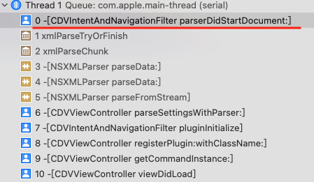 - (void)parser:(NSXMLParser *)parser didStartElement:(NSString *)elementName namespaceURI:(nullable NSString *)namespaceURI qualifiedName:(nullable NSString *)qName attributes:(NSDictionary<NSString *, NSString *> *)attributeDict 在xml元素解析时调用, 解析config.xml中的allow-navigation元素以及allow-intent元素,并将解析的内容分别添加到allowNavigations属性以及allowIntents属性中。