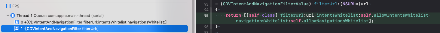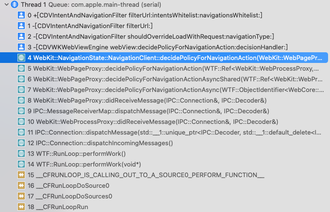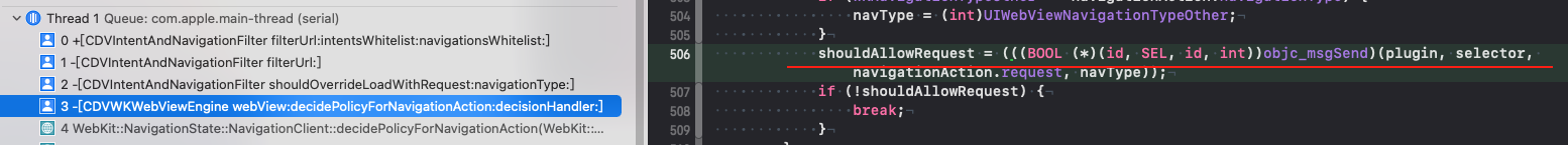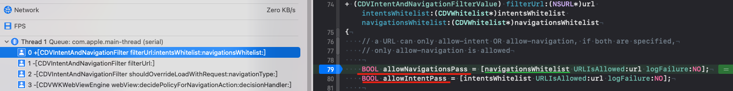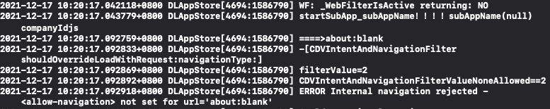 通过日志我们发现在加载页面时-[CDVIntentAndNavigationFilter shouldOverrideLoadwithRequest:navigationType:]中禁止url='about:blank'导航,导致页面内容没有被加载,而显示了空白页。