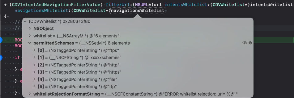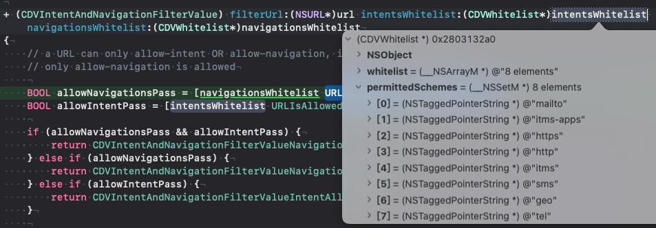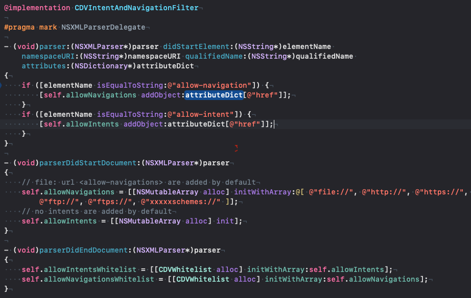 - (void)parserDidEndDocument:(NSXMLParser *)parser 在文档分析结束时调用,通过allowNavigations属性以及allowIntents属性创建了两个白名单