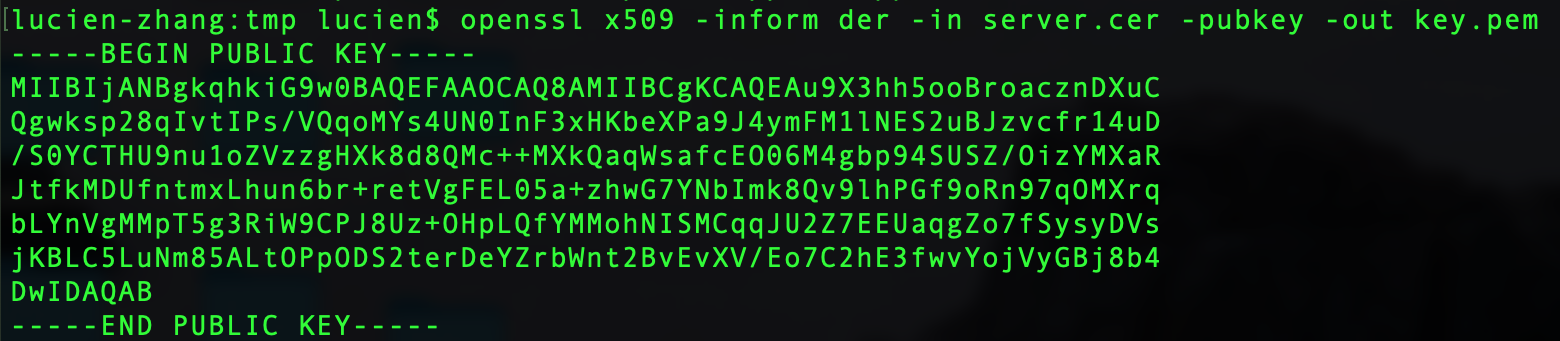 (1)从cer证书中获取Base64字符串公钥(从命令行使用openssl命令获取)如下图:
