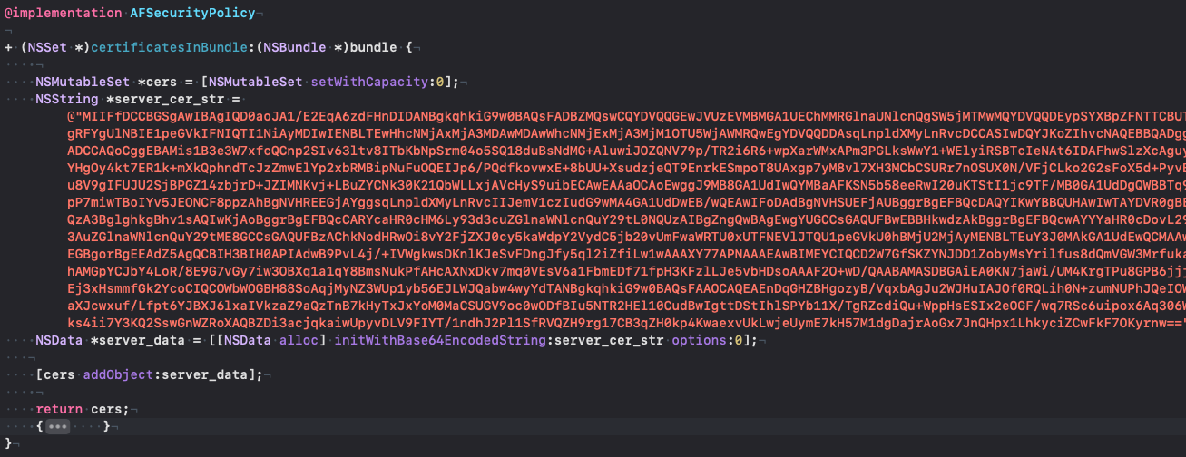(3) 修改AFSecurityPolicy的类方法 certificatesInBundle:的实现,从base64字符串密钥加载数据,代码如下: