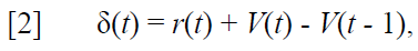 其中V(S)表示所选选项S的价值,η是学习率参数,而δ(toutcome)是在两个连续时间步骤(tstimulus和toutcome = tstimulus + 1)。第二个公式将时间 t 的奖励预测误差定义为: