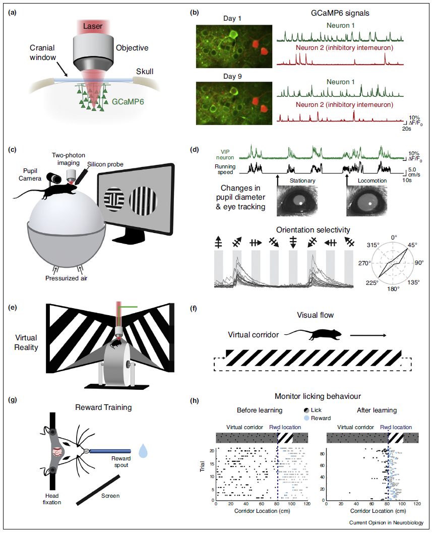 图1 | 记录头固定清醒行为啮齿动物神经活动和相关行为参数的实验程序。(a) 初级视觉皮层(V1)上方的颅骨窗准备示意图,允许用基因编码钙指示剂(GCaMP6)标记神经元的慢性双光子成像。(b) GCaMP6标记的神经元(绿色)可以在数天甚至数周内成像(例如成像第1天和第9天的视野)。荧光(ΔF/F0)随时间的相对变化被用作神经元活动的代理读出。来自基因定义的细胞亚群的信号可以通过第二个荧光标记分离出来(例如,在生长抑素表达抑制性中间神经元中的tdTomato表达,此处以红色显示)。(c) 头部固定的啮齿动物可以在一个空气支撑的聚苯乙烯泡沫塑料球上自由移动,这个球就像一个球形跑步机,同时进行钙成像和/或电生理记录。光学计算机鼠标用于评估运行速度。瞳孔直径和眼睛跟踪可以用相机记录。在这种配置中,动物可以在开放的虚拟现实环境中导航,或者查看视觉刺激,在那里,可以通过运动做出左/右行为选择。(d) 神经元的活动可以与跑步速度和瞳孔直径的变化相关联,作为一种唤醒的测量。来自V1 VIP表达中间神经元的GCaMP6信号以绿色显示,动物的速度以黑色显示。正如传统上在麻醉动物身上所做的那样,V1中的神经元活动能够以被动观察刺激的形式与视觉刺激相关联,例如屏幕上显示的漂移光栅。下图显示了GCaMP6标记神经元对不同方向光栅的单个试验(灰色)和平均反应(黑色)。极坐标图显示钙瞬变对每个方向的响应幅度,归一化为最大响应。(e) 头部固定的啮齿动物可以被放置在一个虚拟的环境中:动物就像在一个线性跑步机上一样奔跑,在周围的屏幕上,它们可以通过定义的墙壁模式在虚拟的走廊中导航。请注意,球形跑步机可以由一个圆柱轮代替,其中一个光学编码器连接到中心轴记录速度。(f) 利用虚拟现实环境,动物所经历的视觉流可以被测量和操纵。一只动物在虚拟走廊上导航,创造了视觉流:实验者可以操纵这种耦合,在视觉流和动物的运动之间创造一种不匹配。(g) 通过头固定动物视觉引导任务,可以研究V1中的经验依赖性神经元变化。缺水动物在关键的实验线索和目标导向行为中学会舔,以便通过喷口获得水奖励。(h) 在执行任务期间,舔嘴上的舔嘴传感器监测舔嘴行为。一个任务的例子,在这个任务中,动物必须舔一个由视觉提示(定向光栅)沿虚拟轨道划分的奖励位置。每个点代表一次舔:奖励前舔(黑点),奖励舔在正确的视觉线索(蓝点)和奖励后舔(灰点)。随着学习,舔行为与奖励视觉线索在赛道上的位置紧密耦合。