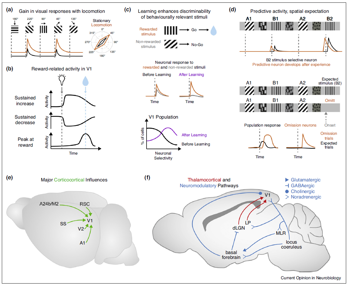 图2 | V1中的神经元活动是由行为状态和经验依赖过程形成的,通过整合非视觉输入来调节。(a) 示意图显示了在运动(橙色轨迹)和静止期(黑色轨迹)期间,神经元对定向光栅的响应增加。加性(如图所示)和乘性增益调节在V1兴奋性神经元中均有报道[22]。图示基于参考文献[10]。(b) V1中奖励时间表征的示意图。在学习一项与视觉线索(灯泡)和奖励(蓝点)相关的任务后,V1中的神经元反应通过在视觉刺激开始后维持活动的增加或减少(灰色虚线)或在预期奖励时间达到峰值(蓝色虚线)来预测奖励事件的时间。插图基于参考文献[37,38]。(c) 视觉引导任务学习期间V1反应示意图。使用两个定向光栅的通过/不通过任务的示例,只奖励一个光栅(蓝色水滴)。一个神经元对两种刺激的反应示意图表明,神经元对奖励(橙色)和非奖励(灰色)刺激的辨别能力随着任务学习而增强。在群体水平上(下图),V1中较高比例的神经元在学习后表现出对任务相关光栅的选择性增加(紫色)。插图基于参考文献[43]。(d) 视觉刺激对空间期望的反应示意图。顶面板:一个范例的示意图,在这个范例中,动物沿着一个虚拟轨迹呈现一系列视觉线索。痕迹说明神经元对视觉线索的反应,之前(黑色)和之后(橙色)重复暴露于同一序列。V1神经元群对给定的视觉刺激(如垂直光栅)有特异性反应,但对特定空间位置的给定刺激也有特异性反应(对大于B1的B2位置垂直光栅的反应)。根据经验,一群神经元会发展出预测性反应,将其反应的起始点转移到他们喜欢的刺激出现之前(橙色轨迹)。底部面板说明了在训练序列中省略预期刺激的效果。在总体水平上,当刺激存在时,对刺激有一个诱发反应(黑色轨迹),但当刺激被意外忽略时(橙色轨迹),活动有一个大的和延迟的增加。神经元亚群对这些遗漏事件有选择性的反应,而不是对最初预期的刺激。插图基于参考文献[28]。(e) V1的主要皮质-皮质输入示意图,包括来自更高视觉区域(V2)、脾后皮质(RSC)和次级运动区(A24b/M2)的自上而下影响,以及来自其他感觉方式的输入,如初级听觉皮质(A1)和体感皮质(SS)。来自更高视觉区(V2)的输入包括来自外侧、内侧和中外侧次级视觉区的连接。(f) 神经调节和丘脑皮层对V1的输入示意图,已被证明影响清醒行为小鼠的V1活动。LP,外侧后核;dLGN,外侧膝状体背侧核;MLR,中脑运动区。