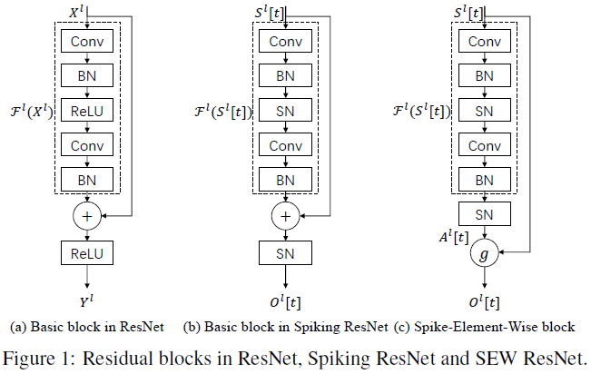 在此,我们提出了Spike Element Wise(SEW)残差块来实现SNN中的残差学习,它可以容易地实现恒等映射,同时克服梯度消失/爆炸问题。如图1(c)所示,SEW残差块可公式化为: