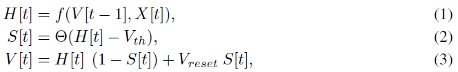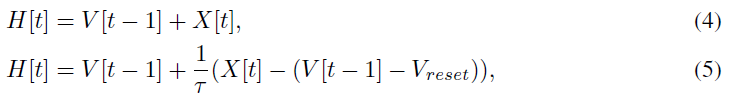 其中X[t]是时间步骤 t 的输入电流,H[t]和V[t]分别表示神经元动力学之后和在时间步骤 t 触发脉冲之后的膜电位。Vth是发放阈值,Θ(x)是Heaviside阶跃函数,由Θ(x) = 1(对于x ≥ 0)和Θ(x) = 0(对于x < 0)定义。S[t]是时间步骤 t 处的输出脉冲,如果存在脉冲,则等于1,否则等于0。Vreset表示复位电位。公式(1)中的函数f(·)描述了神经元动力学,并针对不同的脉冲神经元模型采取了不同的形式。例如,IF模型和LIF模型的函数f(·)可分别由公式(4)和公式(5)描述。