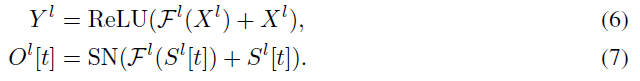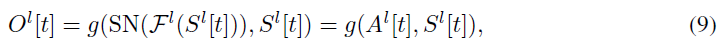 其中g表示具有两个脉冲张量作为输入的逐元素函数。这里,我们使用Al[t]表示要学习的残差映射为Al[t] = SN(Fl(Sl[t]))。