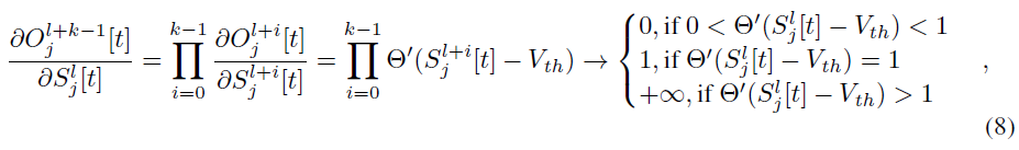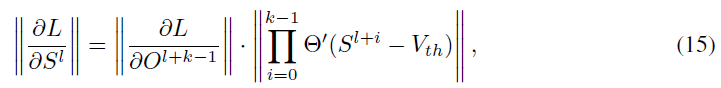 Spiking ResNet suffers from the problems of vanishing/exploding gradient. 考虑具有k个连续块的脉冲ResNet来传输Sl[t],并且满足恒等映射条件,例如,脉冲神经元是0 < Vth ≤ 1的IF神经元,那么我们有Sl[t] = Sl+1[t] = … = Sl+k-1[t] = Ol+k-1[t]。将Sl[t]和Ol[t]中的第 j 个元素分别表示为