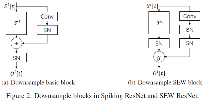 Formulation of downsample block. 值得注意的是,当一个块的输入和输出具有不同维度时,捷径被设置为步幅>1的卷积层,而不是恒等连接,以执行下采样。ResNet和Spiking ResNet在捷径中使用不含ReLU的{Conv-BN}(图2(a))。相反,我们在捷径中添加了一个SN(图2(b))。