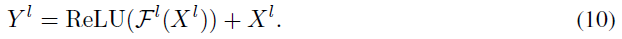 公式(6)的残差块使得在ANN中实现恒等映射变得容易。要看到这一点,当Fl(Xl) ≡ 0时,Yl = ReLU(Xl)。在大多数情况下,Xl是先前ReLU层的激活(Xl ≥ 0)。因此,Yl = ReLU(Xl) = Xl,这是恒等映射。