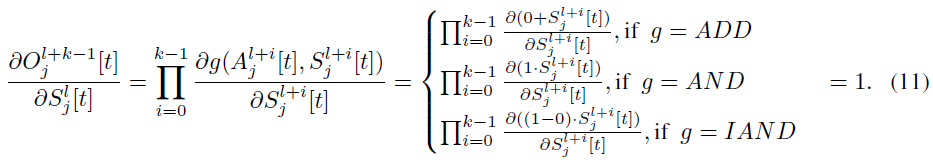 第二个等式成立,因为通过为g = AND设置Al+i[t] ≡ 1,为g = ADD/IAND设置Al+i[t] ≡ 0来实现恒等映射。由于公式(11)中的梯度是常数,SEW ResNet可以克服梯度消失/爆炸问题。