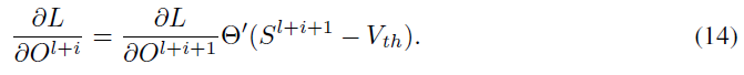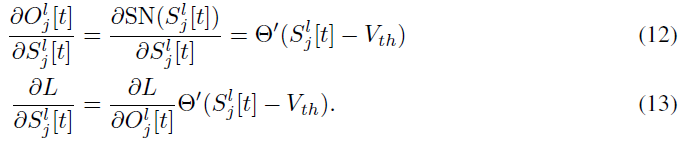 其中 τ 表示膜时间常数。公式(2)和公式(3)描述了脉冲产生和重置过程,这对于所有类型的脉冲神经元模型都是相同的。在本文中,在误差反向传播期间,使用替代梯度方法定义