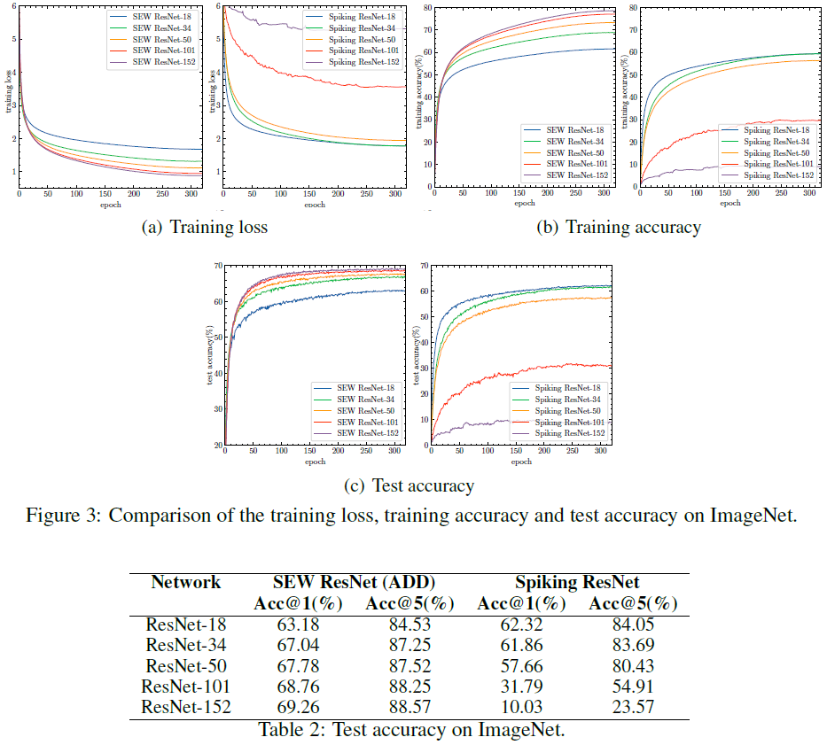 Spiking ResNet vs. SEW ResNet. 我们首先评估Spiking ResNet和SEW ResNet的性能。表2报告了ImageNet验证的测试准确性。结果表明,较深的34层Spiking ResNet比较浅的18层Spiking ResNet具有更低的测试精度。随着层的增加,Spiking ResNet的测试精度会降低。为了揭示原因,我们比较了Spiking ResNet在训练过程中的训练损失、训练准确性和测试准确性,如图3所示。我们可以发现Spiking ResNet的退化问题——较深的网络比较浅的网络具有更高的训练损失。相比之下,较深的34层SEW ResNet比较浅的18层SEW ResNet具有更高的测试精度(如表2所示)。更重要的是,从图3中可以发现,随着深度的增加,我们的SEW ResNet的训练损失减少,训练/测试精度增加,这表明我们可以通过简单地增加网络的深度来获得更高的性能。所有这些结果表明,SEW ResNet很好地解决了退化问题。