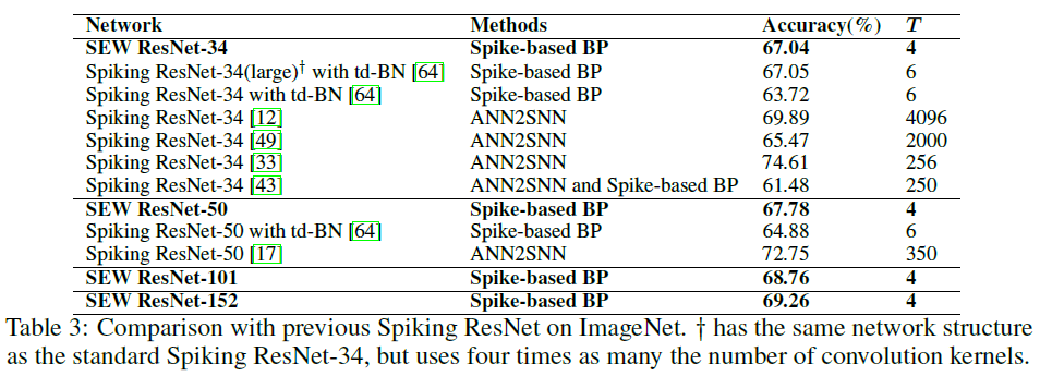 Comparisons with State-of-the-art Methods. 在表3中,我们将SEW ResNet与之前在ImageNet上获得最佳结果的Spiking ResNet进行了比较。据我们所知,SEW ResNet-101和SEW ResNet-152是迄今为止唯一具有100层以上的SNN,没有其他具有相同结构的网络可供比较。当网络结构相同时,即使时间步长T较少,我们的SEW ResNet也优于直接训练的Spiking ResNet的最先进精度。SEW ResNet-34的精度略低于具有td-BN的Spiking ResNet-34(大)(67.04% v.s. 67.05%),与我们的SEW ResNet相比,它使用了1.5倍的模拟时间步长T(6 v.s. 4)和4倍的参数量(85.5M v. s. 21.8M)。最先进的ANN2SNN方法[33, 17]比我们的SEW ResNet具有更好的精度,但它们分别使用的时间步长是我们的64倍和87.5倍。