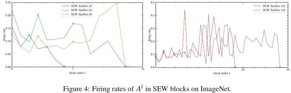 Analysis of spiking response of SEW blocks. 图4显示了ImageNet上SEW ResNet-18/34/50/101/152中Al的发放率。SEW ResNet-18有7个块,SEW ResNet-34和SEW ResNet-50有15个块,SEW ResNet-101有33个块,以及SEW ResNet-152有50个块。下采样SEW块由三角形向下符号标记