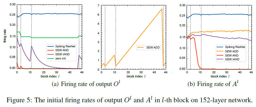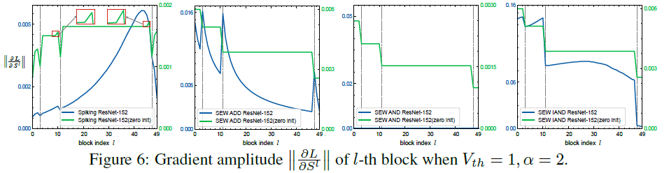 和σ'(1 - Vth) = 1,这也可以解释为什么梯度指数曲线在某些区域是水平的。当参考零初始化的SEW ResNet-152时,可以发现无论我们选择什么g,所有梯度指数曲线都是相似的。这是由于在恒等映射区域中,Sl对于所有索引 l 都是常数,并且梯度也变为常数,因为它不会流过SN。在没有零初始化的情况下,SEW AND ResNet-152中会出现梯度消失,这是由静默问题引起的。当从更深的层传播到更浅的层时,由于图5所示的足够的发放率,SEW ADD、IAND网络的梯度缓慢增加。