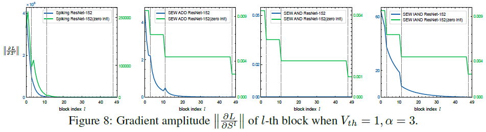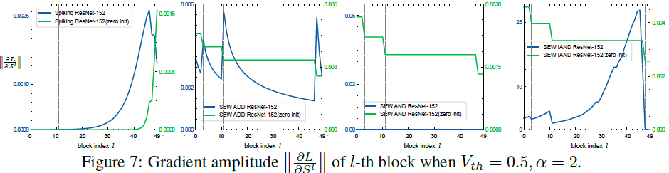 当Vth=0.5,α = 2时,σ'(0 - Vth) = σ'(1 - Vth) = 0.288 < 1,表明将脉冲传输到SN容易导致梯度消失,如图7所示。在零初始化的情况下,Spiking ResNet-152中的衰减更加严重,因为来自Fl的梯度不能起作用。无论我们选择什么g,SEW ResNet-152都不会受到影响。当Vth=1,α = 3时,σ'(1 - Vth) = 1.5 > 1,表明将脉冲传输到SN容易导致梯度爆炸。图8显示了这种情况下的梯度。与图6中的原因相同,在没有零初始化的情况下,替代函数的变化会增加所有网络的梯度,但不会影响零初始化的SEW ResNet-152。Spiking ResNet-152遇到梯度爆炸,而SEW ADD, IAND ResNet-152中的这个问题并不严重。