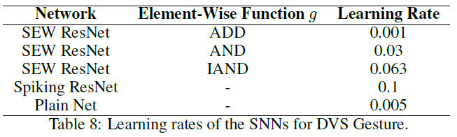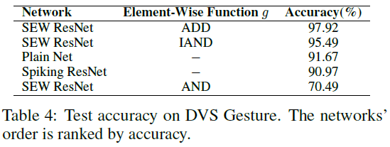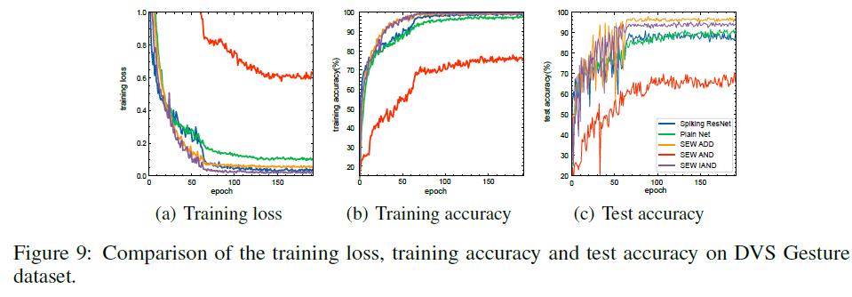 Evaluation of different element-wise functions and plain block. 由于SNN在DVS Gesture数据集上的训练成本比在ImageNet上低得多,我们在DVS Gesture数据集上进行了更多的消融实验。我们用普通块(无捷径)代替SEW块,并测试其性能。我们还在表1中评估了所有类型的元素函数g。图9显示了DVS Gesture的训练损失和训练/测试准确性。早期时期的急剧波动是由大的学习率引起的(见第A.1节)。我们可以发现,训练损失是SEW IAND<Spiking ResNet<SEW ADD<Plain Net<SEW AND。由于过拟合问题,较低的损失并不能保证较高的测试精度。表4显示了所有网络的测试准确性。SEW ADD ResNet的精度最高。