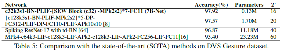Comparisons with State-of-the-art Methods. 表5将我们的网络与SOTA方法进行了比较。可以发现,我们的SEW ResNet在精度、参数数量和模拟时间步长方面优于SOTA工作。