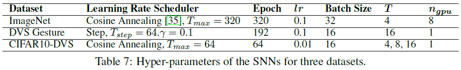 ,其中α是斜率参数。我们为所有神经元设置α=2,Vreset=0和Vth=1。优化器是SGD,动量为0.9。根据[62]的建议,我们在在反向计算图的神经元重置公式(3)中分离S[t],以提高性能。我们使用混合精度训练[36],这将加速训练并减少内存消耗,但可能会导致精度略低于使用全精度训练。不同数据集SNN的超参数如表7所示。表8显示了具有不同元素函数的SNN的学习率(对于DVS Gesture)。三个数据集的数据预处理方法如下: