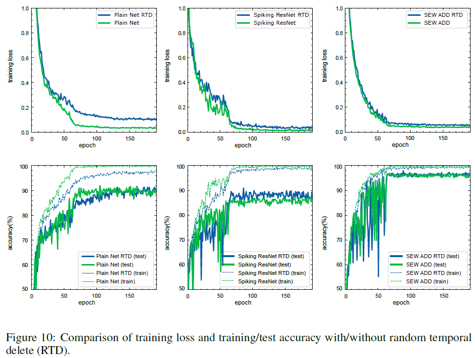 图10比较了有或没有随机时间删除(RTD)的Plain Net、Spiking ResNet和SEW ResNet的训练损失和训练/测试准确性。这里,按元素的函数g是ADD。可以发现,与没有RTD的网络相比,有RTD的网络具有更高的训练损失和更低的训练精度,因为RTD会增加训练的难度。有RTD的网络的测试精度高于没有RTD的网络,表明RTD会减少过拟合。三种网络的结果是一致的,表明RTD是一种通用的序列数据增强方法。