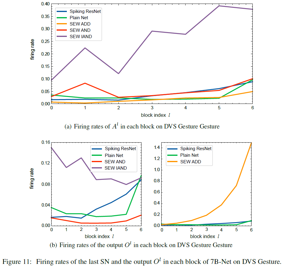 图11(a)显示了DVS Gesture 7B-Net中每个区块中Al的发放率。请注意,如果g为AND,则当发放率接近1时,SEW块变得更接近恒等映射,而对于其他g,当发放率靠近0时,SEV块变成恒等映射。当所有SEW块都变成恒等映射时,7B网络将变成c32k3s1-BN-PLIF-{MPk2s2}*7-FC11,这是一个过于简单的网络,会导致欠拟合。因此,7B-Net中的SEW块不必是恒等映射。图11(b)显示了每个块的输出Ol的发放率。发放率不会随着块索引的增加而严格降低,因为块通过最大池连接,最大池挤压稀疏脉冲并增加发放率。可以发现,SEW AND网络中的块具有最低的发放率。SEW IAND网络中的块比SEW AND网络的块具有更高的发放率,并且SEW IAND网络的准确率远高于SEW AND网络(95.49% v.s. 70.49%),这表明使用IAND代替AND可以缓解第4.1节中讨论的静默问题。