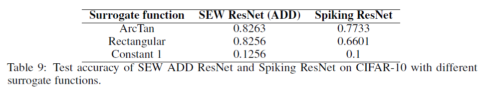 表9表明,替代函数的选择对SNN的性能有相当大的影响。尽管矩形和常数1可以避免公式(8)中的梯度爆炸/消失问题,但它们仍然会导致较低的精度,甚至使优化不收敛。表9还显示,SEW ResNet对替代梯度更具鲁棒性,因为它总是比具有相同替代函数的Spiking ResNet具有更高的精度。