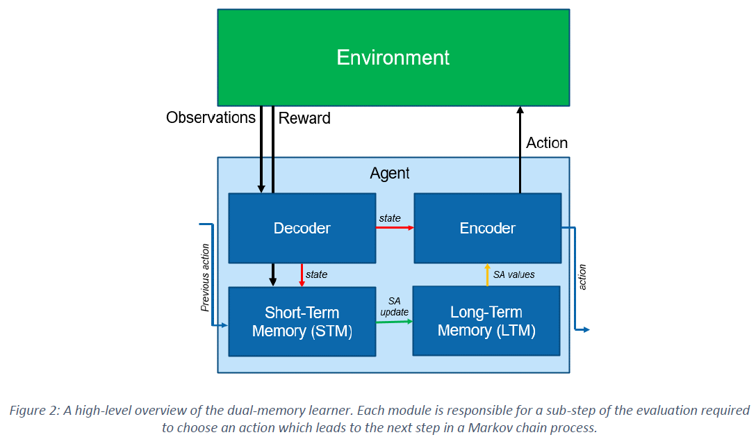 对马尔可夫决策过程建模的RL智能体中的基本时期或"步骤"需要几个子步骤:识别智能体的当前状态,使用此信息来决定给定当前策略的适当动作,将此动作以有意义的方式返回到环境中,并可能应用奖励信号来更新内部价值估计和策略。我们定义了特定的模块和/或交互来满足这些需求中的每一个,形成DML的核心结构并允许它通过并行和本地操作来实现。我们定义的四个模块是解码器、短期记忆(STM)、长期记忆(LTM)和编码器(图2)。