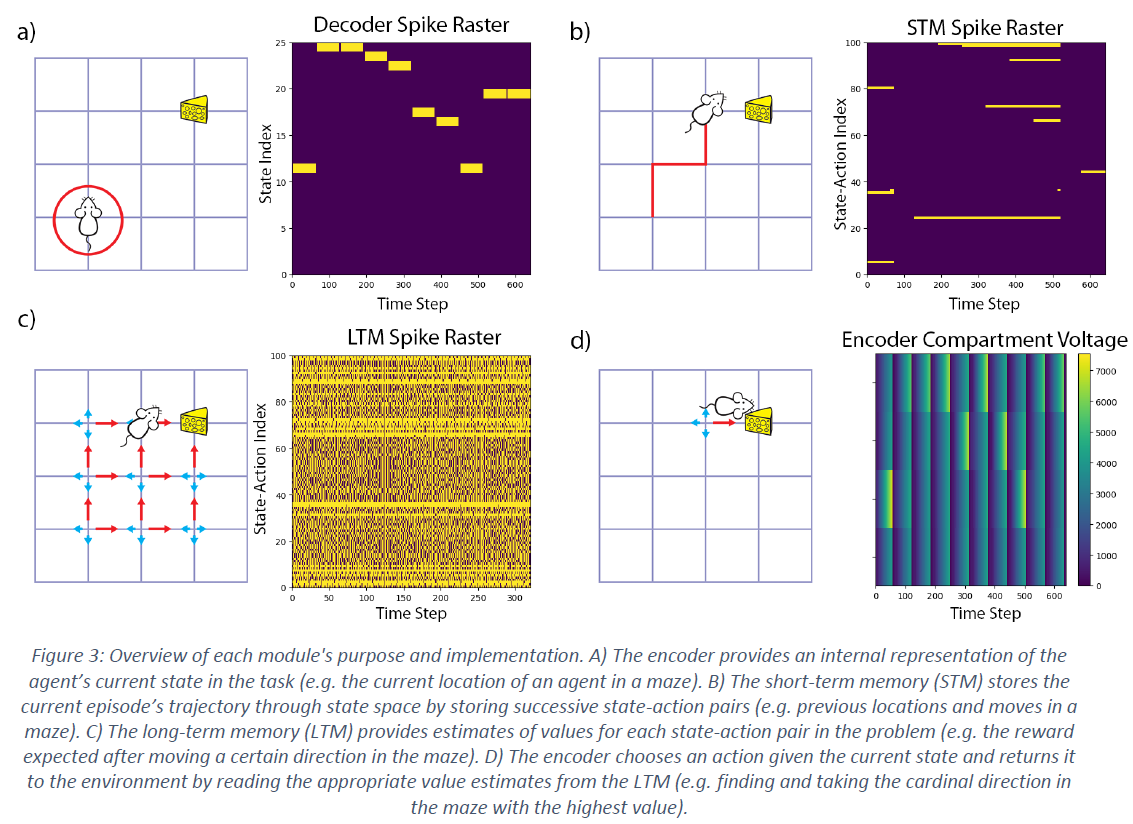 为了选择适合当前状态的动作,编码器使用来自解码器的信息来过滤LTM的输出(图3d)。仅读取与当前状态下可能的动作相对应的LTM的输出,解码器选择具有最高价值的动作(贪婪),或者可选地,可以选择具有设定概率的随机动作(ε-贪婪)。目前,所需的argmax和随机选择操作是通过在Loihi芯片上共同集成的x86处理器完成的,尽管它们可以通过赢家通吃(WTA)或带噪WTA电路来代替,以实现DML12的纯脉冲实现。