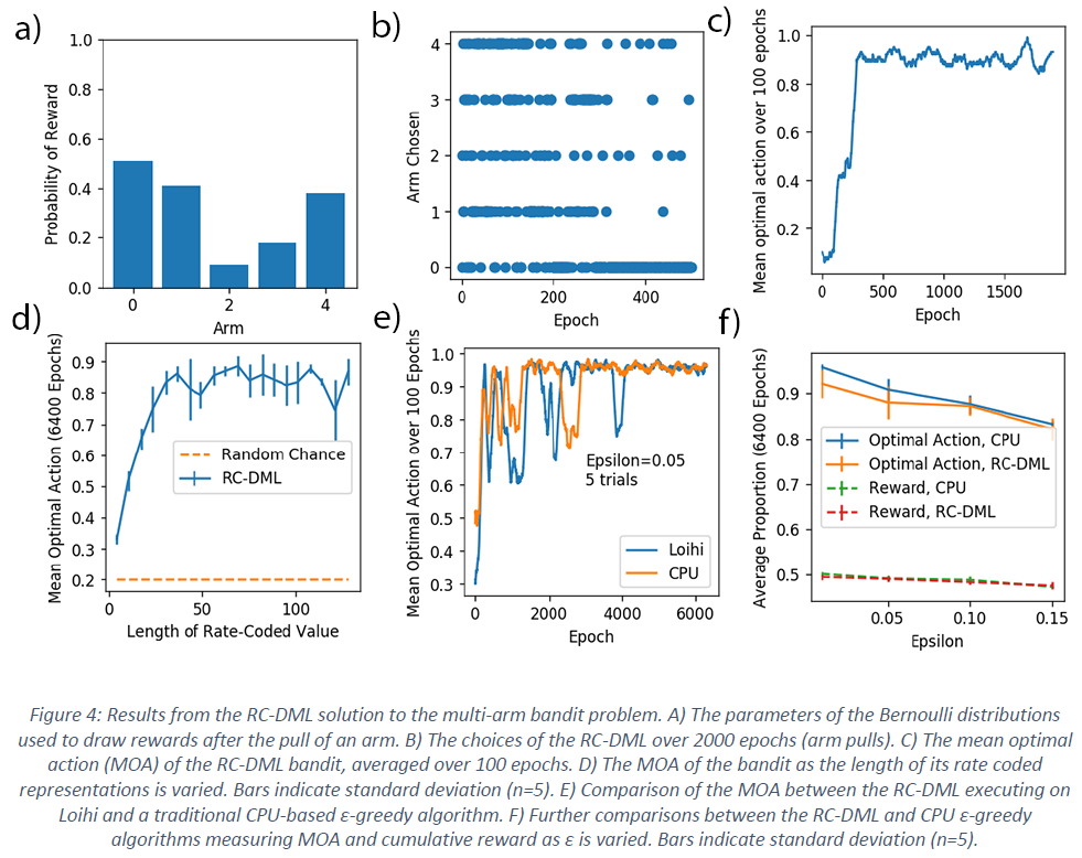作为其功能的基本演示,我们首先将发放率编码DML (RC-DML)应用于多臂读博机(MAB)问题。虽然它没有将"状态"的概念纳入问题,但MAB本身就是一个复杂的问题,它解决了RL的许多基本方面6。在MAB中,向智能体呈现了一系列"臂",每个臂都有一个隐藏的真实参数,该参数控制当臂被"拉动13"时获得奖励的概率。在此,基本的学习问题是使用与赌博机的最少交互次数来找到哪个臂给出最高奖励,以最大化累积奖励。