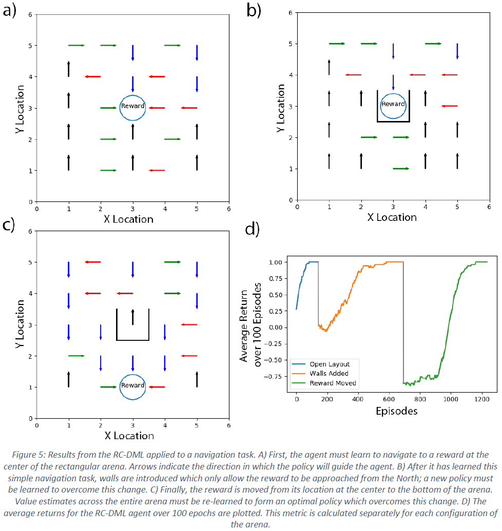 一组VC表示遵循当前策略的所有状态-动作对的期望回报(图3c)。智能体策略是在给定当前状态的情况下,由对动作价值估计的简单贪婪或ε-贪婪选择形成的。在一个回合结束时,这些价值期望通过使用存储在STM中的轨迹将奖励信号路由到其相应的VC来更新。然后,这些信号可以根据需要逐步调整每个VC,创建新的价值估计并允许推导出新的策略。