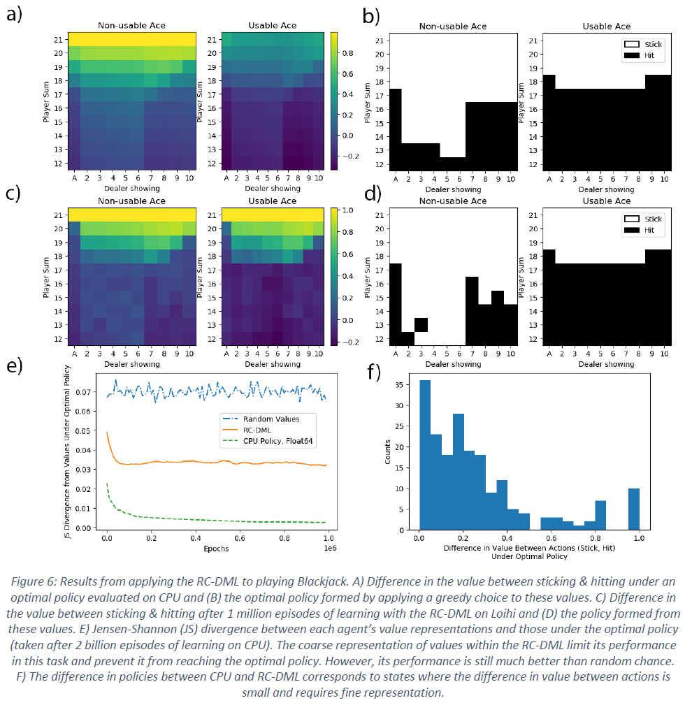 只要用于对价值进行发放率编码的周期长度在大约40步以上,神经形态RC-DML就展示了MAB的学习性能,这与在CPU上运行的传统非脉冲ε-贪婪算法相当(图4d, e)。基于CPU的算法在各种 ε 值的前6400个学习epoch中,在最优动作的比例和平均奖励方面保持较小的性能领先(图4f)。这是由于RC-DML中的价值表征的准确性有限,因为它使用了发放率编码,这后来限制了它在Blackjack中的性能。在使用64位浮点值表示的基于CPU的算法中不存在这样的障碍。