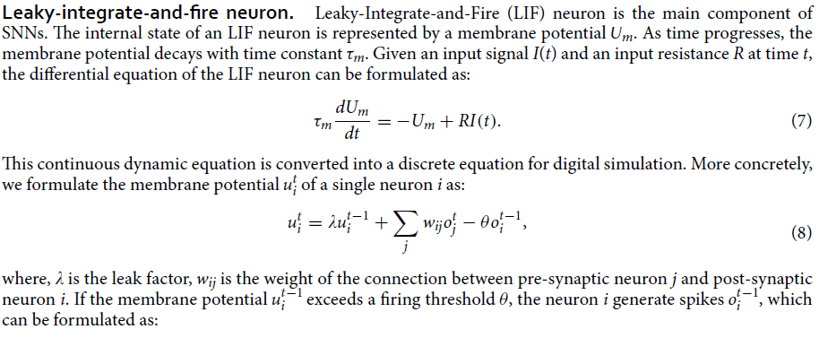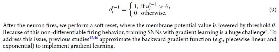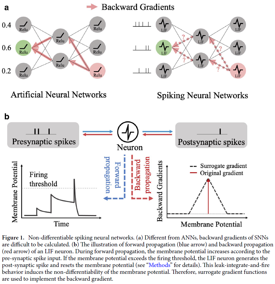 在最近的过去,两种广泛的SNN算法优化方法在使SNN在图像分类方面的性能更接近ANN方面取得了长足的进步(甚至在被认为是图像分类任务中的"奥林匹克"的Imagenet数据集上)。第一种方法,Conversion15-18,通过对发放阈值或权重进行归一化,将预训练的ANN转换为SNN,以将 ReLU(整流线性单元)激活转换为Integrate-and-Fire (IF)脉冲激活。到目前为止,转换技术已经能够在大规模架构和数据集上实现与ANN对应的竞争精度,但会产生较大的延迟或处理时间步长。第二种方法包括替代梯度下降方法16,19,20,这些方法使用近似梯度函数训练SNN,以克服LIF脉冲神经元的不可微分性。这些方法使SNN能够以更低的延迟和合理的分类精度从头开始训练。