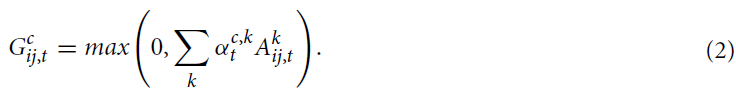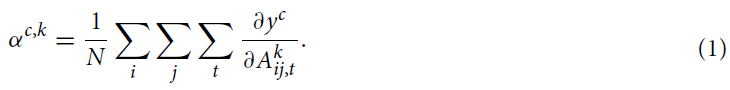 是第 k 个通道在时间步骤 t 的脉冲激活值,(i, j)是像素位置。请注意,我们使用给定图像的真实标签 c 来计算热图。因此,脉冲激活的通道加权和可以计算为: