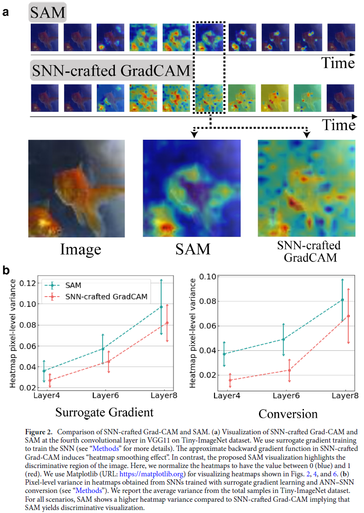 SNN制作的Grad-CAM受到我们所说的"热图平滑效应"的影响,这种效应是由近似的反向梯度函数引起的。为了在浅层/初始层可视化热图,来自输出的梯度需要使用近似的后向函数穿过多个层(参见补充说明1)。累积的近似误差产生一个非判别热图,如图2a所示。请注意,开始和结束时间步骤几乎没有脉冲活动20,导致热图为零值。为了定量验证"热图平滑效果",我们计算了热图的像素方差。因此,包含非判别信息(即相似像素值)的热图应该具有较低的方差。在图2b中,与我们提出的SAM相比,SNN制作的Grad-CAM显示出较低的方差(将在下一节中讨论)。在SNN可视化中,有多个热图(即每个时间步骤一个热图)。因此,我们在图2b的所有时间步骤中使用最大方差值。此外,我们注意到图2a中SAM和SNN制作的Grad-CAM中的热图可视化在每个时间步骤上都不同,这表明SNN随着时间的推移查看相同输入的不同区域以进行预测。总体而言,SNN的可视化工具需要一个新的视角来规避近似梯度或反向传播的误差累积问题。在我们所有的实验中,我们使用基于LIF神经元的SNN的VGG111架构对复杂的Tiny-ImageNet数据集(即ImageNet数据集的子集)执行图像分类(有关网络架构和数据集的详细信息,请参见补充表1)。