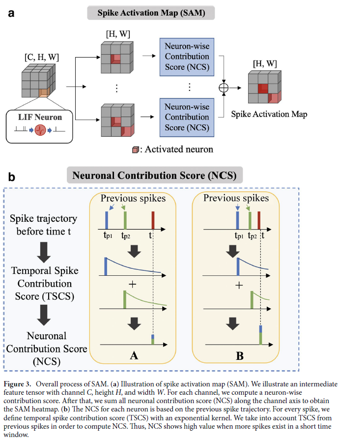 我们在图3a中说明了SAM的整体流程。对于每个神经元,我们计算NCS并在通道轴上添加值以获得SAM。在图3b中,我们描述了计算NCS的两个示例(案例A和案例B)。在案例A中,先前的脉冲发生在时间步骤tp1和tp2上,这两个时间步骤合理地早于当前的脉冲时间 t。结果,由于指数核,先前脉冲的贡献很小。另一方面,在案例B中,tp1和tp2接近当前脉冲时间 t。在这种案例下,神经元具有较高的NCS值。