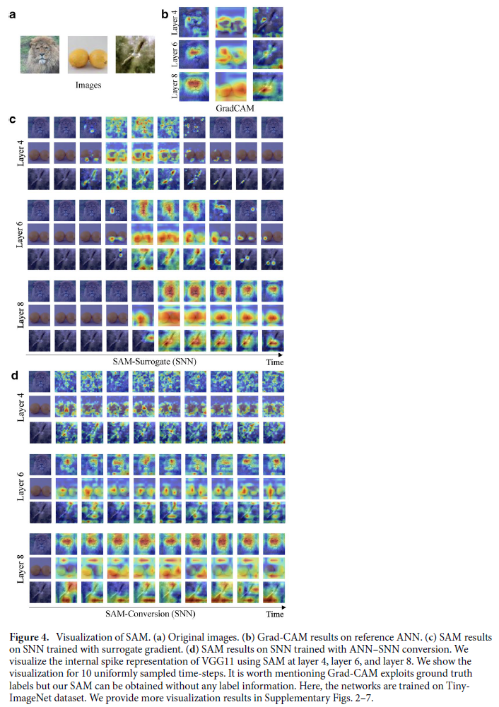 在神经形态工程领域,有几项工作使用神经元活动或权重连接作为可视化工具。51的作者提出了一种实时图形可视化工具,用于分析连通性和生物物理过程(不考虑解释模型的决定)。我们的工作在揭示内部脉冲行为方面也有相同的目标。然而,SAM旨在可视化静态图像中的感兴趣区域,以了解SNN所做的预测。我们的可视化与ANN对应物(如CAM和Grad-CAM)中的视觉解释工作相似。Demin和Nekhaev52可视化了2层SNN中神经元的感受野。对于输出层,他们使用转发和倒数权重矩阵之间的相关性来计算感受野。对于隐藏层神经元,与输入层的权重连接可以直接用作感受野的像素级得分。然而,他们的方法仅限于具有互惠连接的两层网络。因此,很难将他们的方法应用于深度SNN以进行复杂的数据集解释。Deng等人53通过将输入脉冲流转换为基于帧的表示来可视化输入层中累积的脉冲。具体来说,每当发生运动时,它们就会从动态视觉传感器(DVS)相机中累积脉冲,以了解DVS图像的特征。然而,这与模型预测的解释无关(例如,浅/深SNN层在哪里集中进行预测?)。