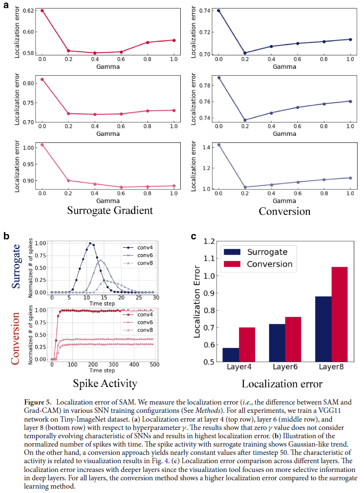 此外,我们进行消融研究以了解超参数 γ 对公式4中SAM的影响。γ值决定了TSCS中指数核函数的陡度。具有高 γ 的核考虑了最近的脉冲历史,而低 γ 考虑了较长的脉冲历史。在图5a中,我们可视化了VGG11 SNN中不同层相对于 γ 的定位误差,用于转换和替代梯度训练方法。对于这两种方法,γ = 0显示最高的定位误差,因为核不过滤冗余和不相关的长ISI脉冲。另一个有趣的观察是,大 γ 值(例如1.0)的定位误差会增加。这是因为高 γ 限制了可靠的可视化,仅考虑最近的脉冲,并在很大程度上忽略了脉冲历史。