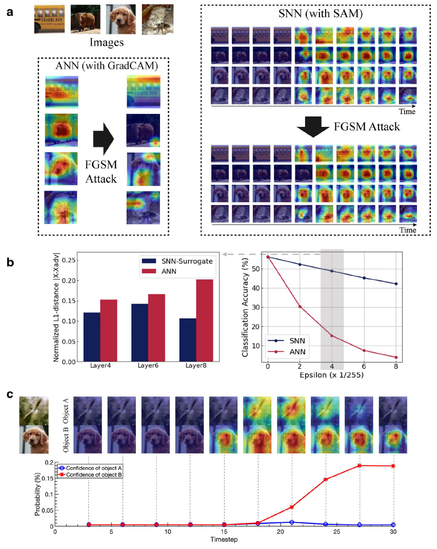 Adversarial robustness of SNN. 与人类视觉系统不同,神经网络容易受到对抗性攻击。这些攻击是通过向输入图像添加小而结构化的扰动来创建的。先前的研究36,41断言,使用替代梯度训练的SNN比ANN对于对抗性输入更稳健。为了展示SNN在对抗性噪声攻击下的有效性,我们对Grad-CAM和SAM进行了定性和定量比较。我们使用快速梯度符号方法(Fast Gradient Sign Method, FGSM)攻击37和SNN精心设计的FGSM攻击36来攻击ANN和SNN,ε = 4/255(有关实现细节,请参见"方法"和补充说明3)。在图6a中,我们观察到Grad-CAM在攻击ANN之前/之后显示出可视化的巨大变化。事实上,攻击后的ANN开始关注图像的随机部分,因此对于对抗性输入进行了错误分类。另一方面,SAM在攻击之前/之后显示几乎相似的结果。有趣的是,我们观察到SAM在对抗性攻击的情况下在较早的时间步骤相对于干净的输入可视化略有变化。但是,随着时间的推移,对抗输入和干净输入之间的可视化看起来相似,突出了合适的感兴趣区域。这意味着SNN中的时间处理能够补偿和校正输入中的任何噪声。我们推测,在SNN中积累时间信息会给系统带来鲁棒性。此外,我们展示了关于攻击强度的分类精度,以及图6b中ε = 4/255处干净图像和对抗图像的热图之间的归一化L1距离。结果表明,在准确性和可视化方面,SNN比ANN更鲁棒(有关其他实验,请参见补充图9)。