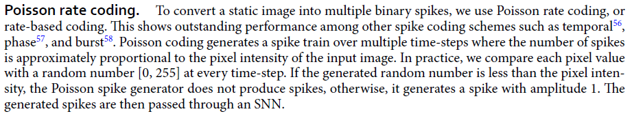 ANN–SNN conversion. 我们使用15中提出的阈值归一化方法来实现ANN-SNN转换方法。发放阈值(公式9中的θ)相对于实际脉冲输入进行归一化,以说明转换过程中的实际SNN操作。首先,我们将预训练的ANN的权重参数复制到SNN。然后,对于每一层,我们计算所有时间步骤的最大激活并将发放阈值设置为最大激活值。转换过程以分层方式设置阈值,从第一层开始,依次经过更深的层(有关详细信息,请参阅补充说明2)。请注意,我们在转换中不使用批量归一化59,因为所有输入脉冲的均值为零。此外,在之前的工作15-17之后,我们在转换过程中对ANN和SNN使用Dropout60。
