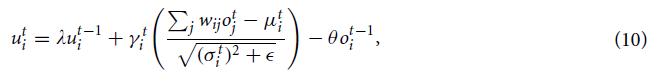 SNN制作的批量归一化层BNTT可提高训练稳定性并减少分类任务的延迟,同时保持准确性。我们在LIF神经元之前添加BNTT层。因此,加权的突触前输入脉冲被归一化为: