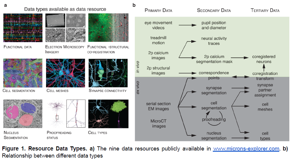 在此,我们介绍了第一个大规模MICrONS数据资源,它基于从P75-87雄性小鼠的大约1 mm3 (1.3✕0.87✕0.82 mm3,体内尺寸)的视觉皮层获取的生理和解剖数据。该数据集在几个关键方面非常出色:它是迄今为止发布的最大的功能连接组学数据集,也是按最小维度、细胞数量和检测到的突触数量计算的最大连接组学数据集,比之前发布的来自MICrONS程序的试点数据集大400倍。由于其规模和位置,该数据集包含多个皮质视觉区域,可以进行区域内和区域间连接分析。我们将这些原始数据和衍生数据产品称为MICrONS多区域数据集。该资源由多种数据类型(图1)组成,可在www.microns-explorer.org在线获取。