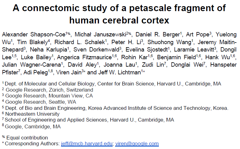 来自联合皮层的人脑组织面临的另一个挑战是,它可能是由于经验而建立的电路的位置。如果记忆存储在人类大脑的这一部分,那么另一个大脑不太可能是相似的,例如,多个秀丽隐杆线虫的大脑是定型的。60但即使在同基因蠕虫中,40%神经元到神经元的连接在样本之间是不同的。鉴于人类经验、行为、记忆和遗传学的变异性要大得多,而且人类和其他脊椎动物拥有已确定的神经元类别而不是单个已确定的神经元类型,因此比较大脑之间的神经回路无疑将具有挑战性。这一挑战也提供了一个机会:揭示学习信息的物理实例化。即使电路在细节上有所不同,也有可能通过查看足够的数据来发现记忆的元逻辑,也许在未来的"图形学"领域61,62。可以肯定的是,揭示神经回路连接数据意义的深刻问题的方法还处于起步阶段,但在我们看来,取得进展的最佳刺激可能是大量的实际数据——这个PB级数据集是 一个开始。