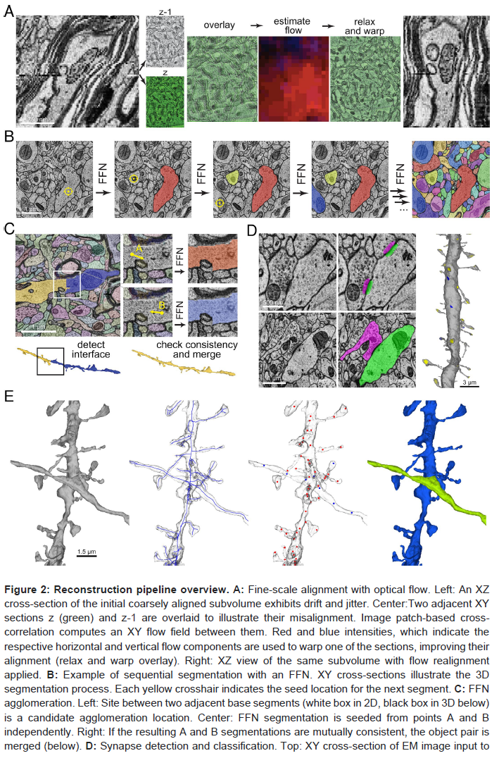 我们通过一系列步骤运行切除的颞叶片段(海马体表层)。我们使用快速浸入固定来出色地保存超微结构。使用ROTO染色方案6进一步保存组织并用锇和其他重金属染色。然后将样品嵌入树脂(epon)块中并修剪。使用自动磁带收集超薄切片机(ATUM; 7),我们以平均33 nm(范围30-40 nm)的切片厚度对5292个片段进行切片,并用多束扫描电子显微镜成像(图1)。使用4 x 4 nm2的像素获取图像。由于切片边缘的必要重叠,原始数据大小高达每个部分350 GB,或者整个部分的集合约为2.1 PB。在示波器采集图像时,定制的工作流程管理器会评估每个图块的质量并标记问题。图像采集的总吞吐量从每秒1.25亿像素到每秒1.9亿像素不等。大部分数据以每秒1.9亿像素的速度采集。1 mm3样品的总成像时间为326天。