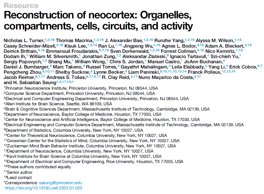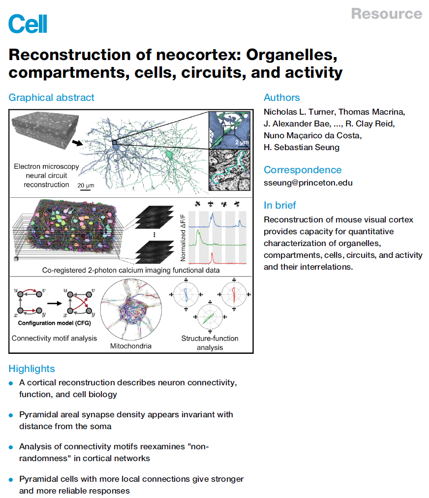 借助图像采集(Kornfeld and Denk, 2018)和分析(Lee et al., 2019)的自动化,从无脊椎动物和脊椎动物物种的电子显微镜(EM)图像重建脑组织的规模和复杂性都在增加。在一些研究中,体内钙成像先于EM重建(Briggman et al., 2011; Vishwanathan et al., 2017; Bae et al., 2018; Wanner and Friedrich,2020)。这种组合的结构-功能方法已应用于小鼠初级视觉(V1)皮层(Bock et al., 2011; Lee et al., 2016),但以前仅限于数十个细胞。在此,我们展示了小鼠V1的重建,包括来自100多个锥体细胞(PyC)的神经元和非神经元细胞、线粒体、细胞核、突触和钙成像。这些数据是公开的(microns-explorer.org),以及用于编程和交互式访问的工具。我们还提供了四个小插曲,探索线粒体、突触、电路基序以及连通性与功能的关系,选择这些小插曲来展示这种多方面重建可以揭示的定量信息的多样性。
