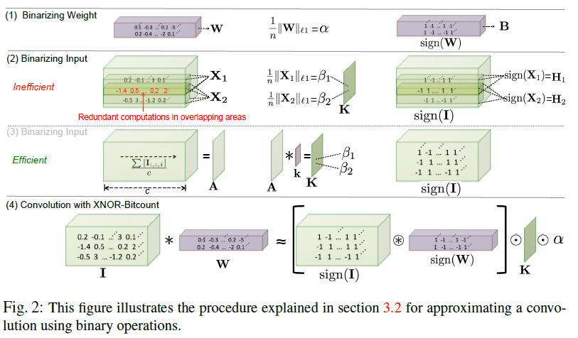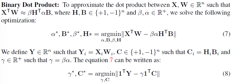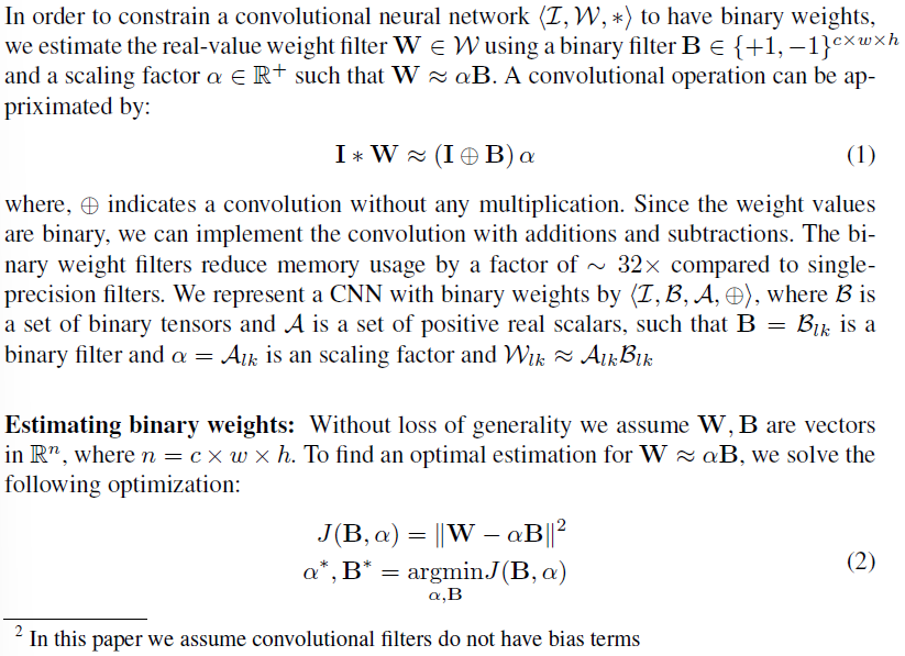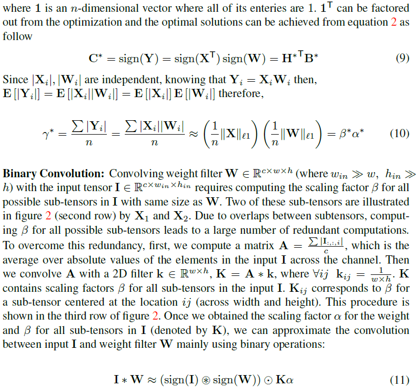 ,其中w ≤ win,h ≤ hin。我们提出了二值CNN的两种变体:二值权重,其中W的元素是二值张量和XNOR网络,其中 I 和 W 的元素都是二值张量。